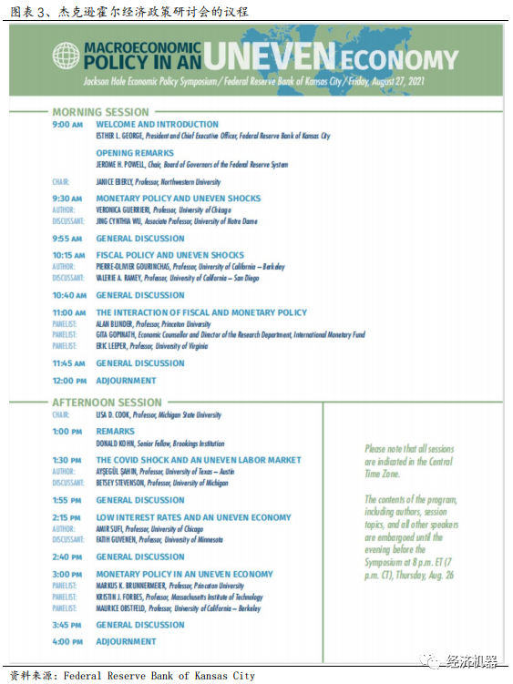 根據(jù)議程,杰克遜霍爾經(jīng)濟(jì)政策研討會(huì)包括上午和下午兩個(gè)時(shí)段,其中上午時(shí)段從九點(diǎn)開始到十二點(diǎn)結(jié)束,而下午時(shí)段從一點(diǎn)開始到四點(diǎn)結(jié)束。具體來看,九點(diǎn)到九點(diǎn)半,會(huì)議舉辦方負(fù)責(zé)人堪薩斯聯(lián)儲(chǔ)主席George將致歡迎辭,隨后美聯(lián)儲(chǔ)主席Powell將通過堪薩斯城聯(lián)儲(chǔ)的YouTube頻道向公眾直播,全市場(chǎng)都在關(guān)注鮑威爾即將做出的聲明,尤其是他是否將做出Taper的表述。九點(diǎn)半之后則開始了學(xué)術(shù)討論,上下午學(xué)術(shù)討論的議程比較一致,都是兩個(gè)單人專題演講加一個(gè)三人小組討論。
