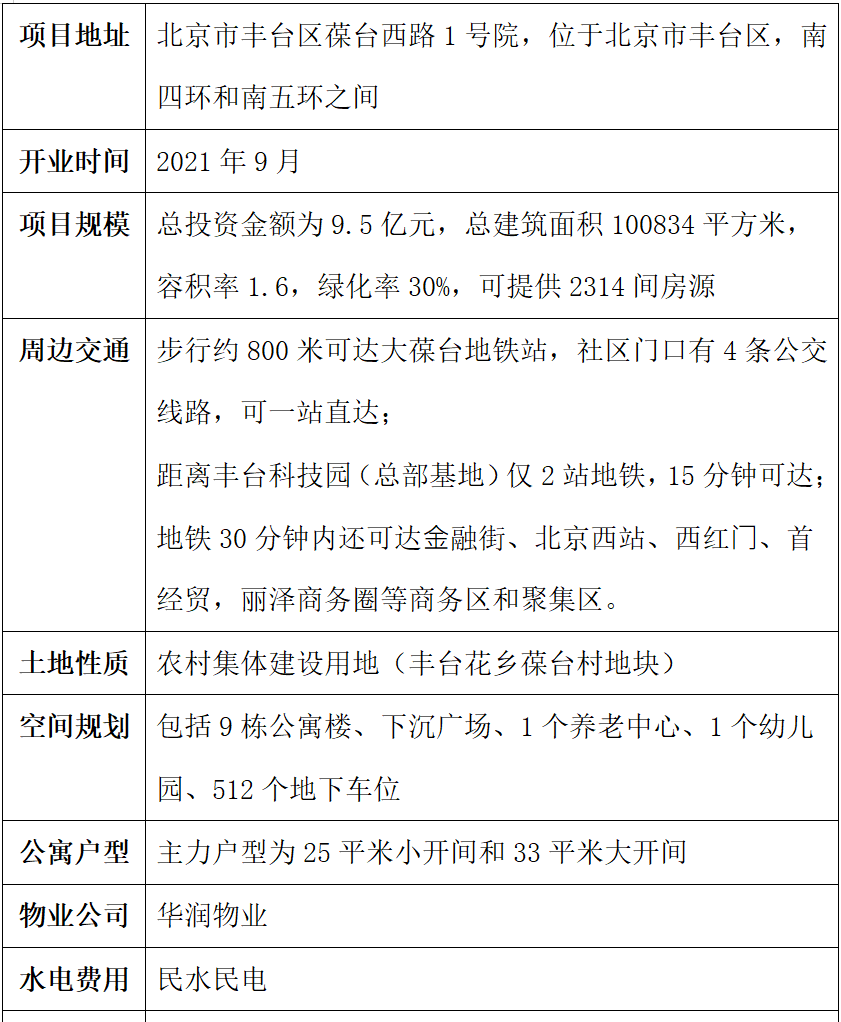 華潤有巢國際公寓社區(qū)總部基地店的項目土地,由豐臺區(qū)花鄉(xiāng)地區(qū)葆臺村提供,在2018年取得《北京市規(guī)劃和國土資源管理委員會鄉(xiāng)村建設規(guī)劃條件》和用地審批后,由華潤置地聯(lián)合平安不動產(chǎn)共同開發(fā),并由華潤置地旗下長租公寓品牌有巢運營。