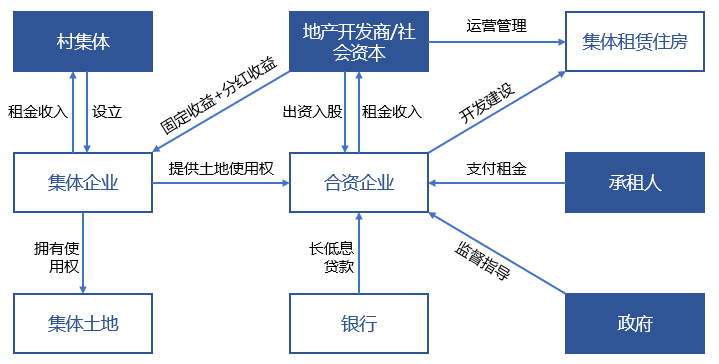 該項目是村集體出讓土地經(jīng)營管理權與收益權,聯(lián)營開發(fā)企業(yè)和社會資本進行合作的模式。具體為:由村集體讓渡租賃住房項目經(jīng)營權,社會企業(yè)出資進行建設并獲得項目50年經(jīng)營權及收益權,包括使用、經(jīng)營、管理、收益等權利(不包括占用權利),社會企業(yè)承擔建設費用和固定收益(保底),村集體獲得固定收益(保底)和分紅收益(遵照約定)。