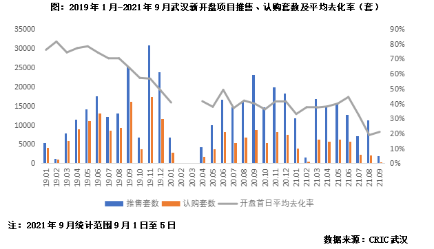 新開盤項目去化表現(xiàn)同樣反映武漢上、下半年市場冰火兩重天。上半年,武漢新開盤項目平均去化率基本保持在40%附近,6月平均去化率一度升至44%,創(chuàng)2020年以來單月新高。不過,8月打新市場顯著遇冷,平均去化率跌至19%,創(chuàng)近年來單月新低。9月初打新市場未見好轉(zhuǎn)跡象,前5日平均去化率仍保持在21%的低位。
