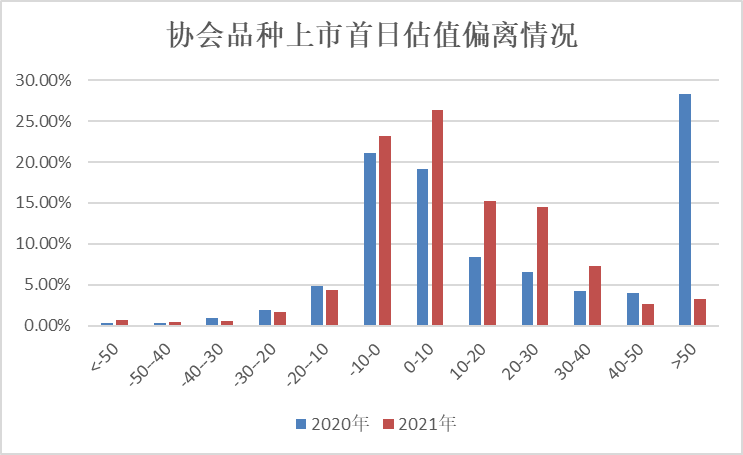還是用數(shù)據(jù)說(shuō)話(huà),先來(lái)看看協(xié)會(huì)產(chǎn)品的上市首日估值和票面利率之差,2021年和2020年的對(duì)比情況。可以看到估值偏離在±10bp的市場(chǎng)化發(fā)行占比有了明顯提高,而偏離50bp這種極端行為(主要集中在scp上),占比從2020年的超過(guò)25%,下降到2021年的不足5%。
