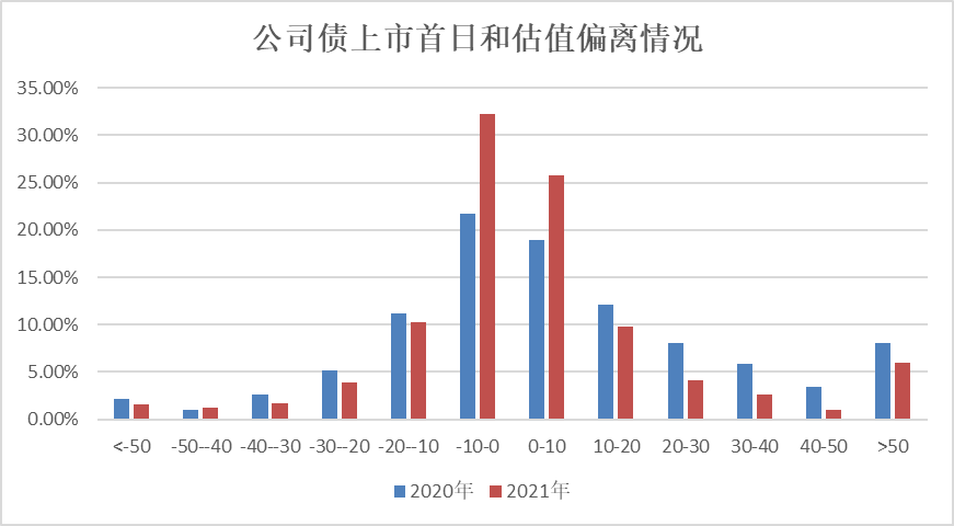 再來(lái)看看公司債的上市首日估值和票面利率之差,2021年和2020年的對(duì)比情況,同樣是估值偏離在±10bp的市場(chǎng)化發(fā)行占比大幅提升。票面利率低于上市首日估值的公司債占比有了明顯下滑。