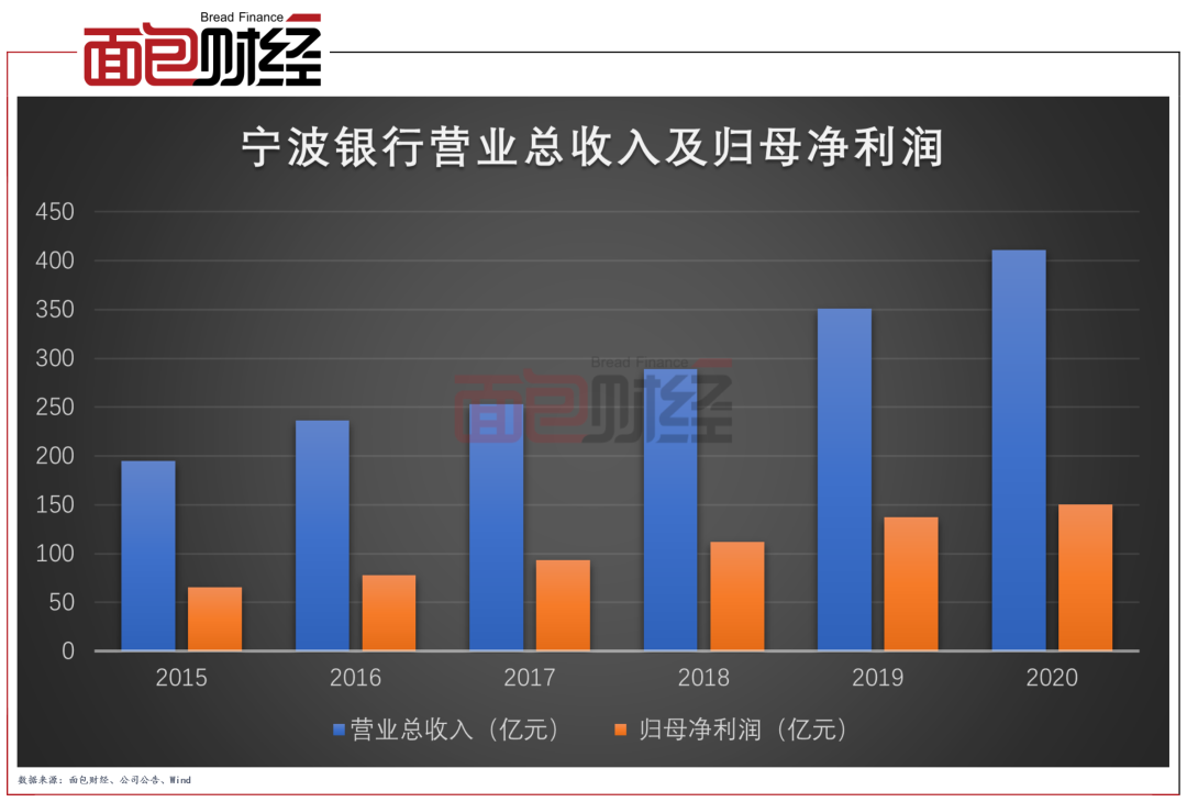 2020年,寧波銀行實現(xiàn)營業(yè)收入411.11億元,同比增加60.29億元,增幅為17.19%;實現(xiàn)歸母凈利潤150.50億元,同比增加13.36億元,增幅為9.73%。