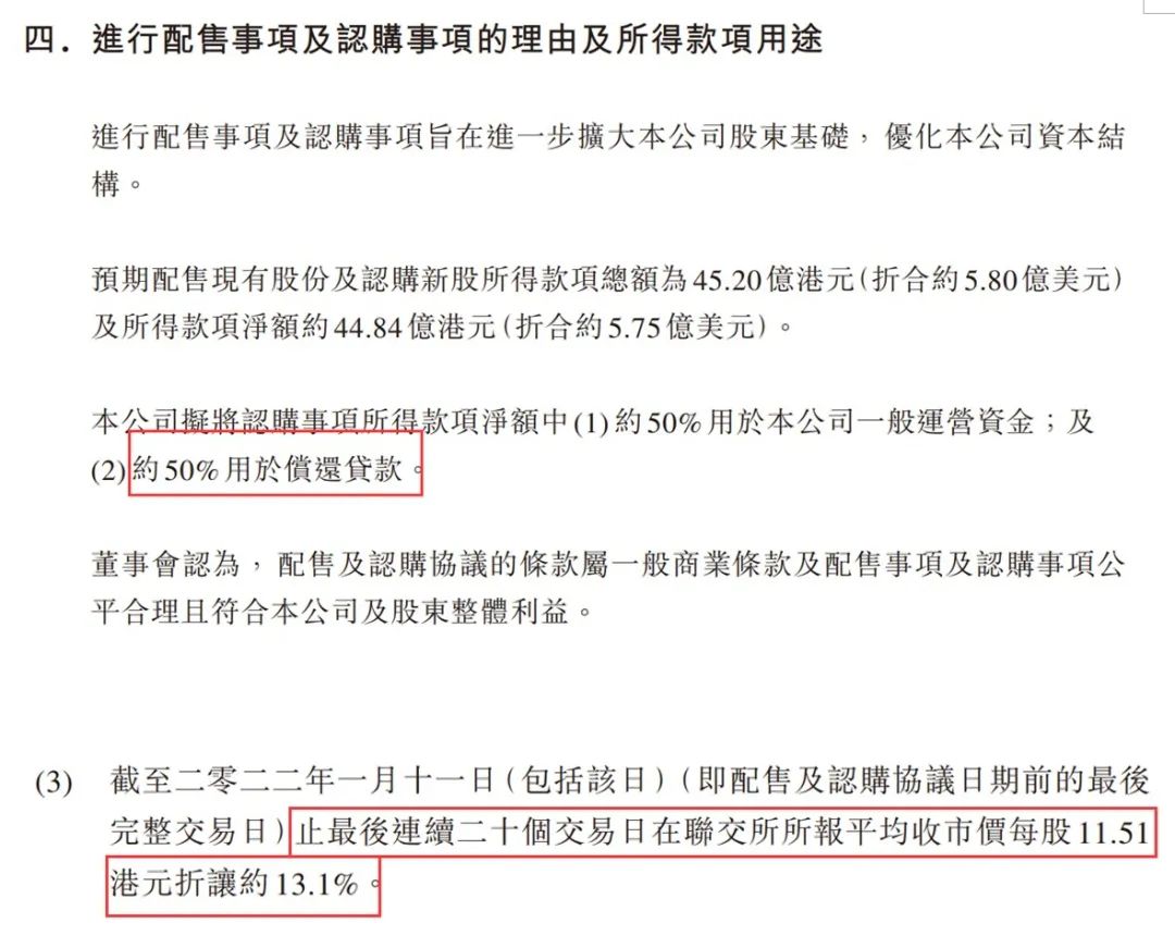 此次配售有兩大關(guān)注點(diǎn):一是相比近二十個(gè)交易日平均收盤價(jià)折了13.1%;二是根據(jù)公告,配售所得款項(xiàng)50%將用于償還貸款。