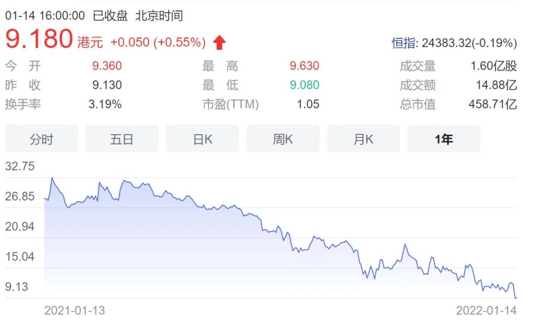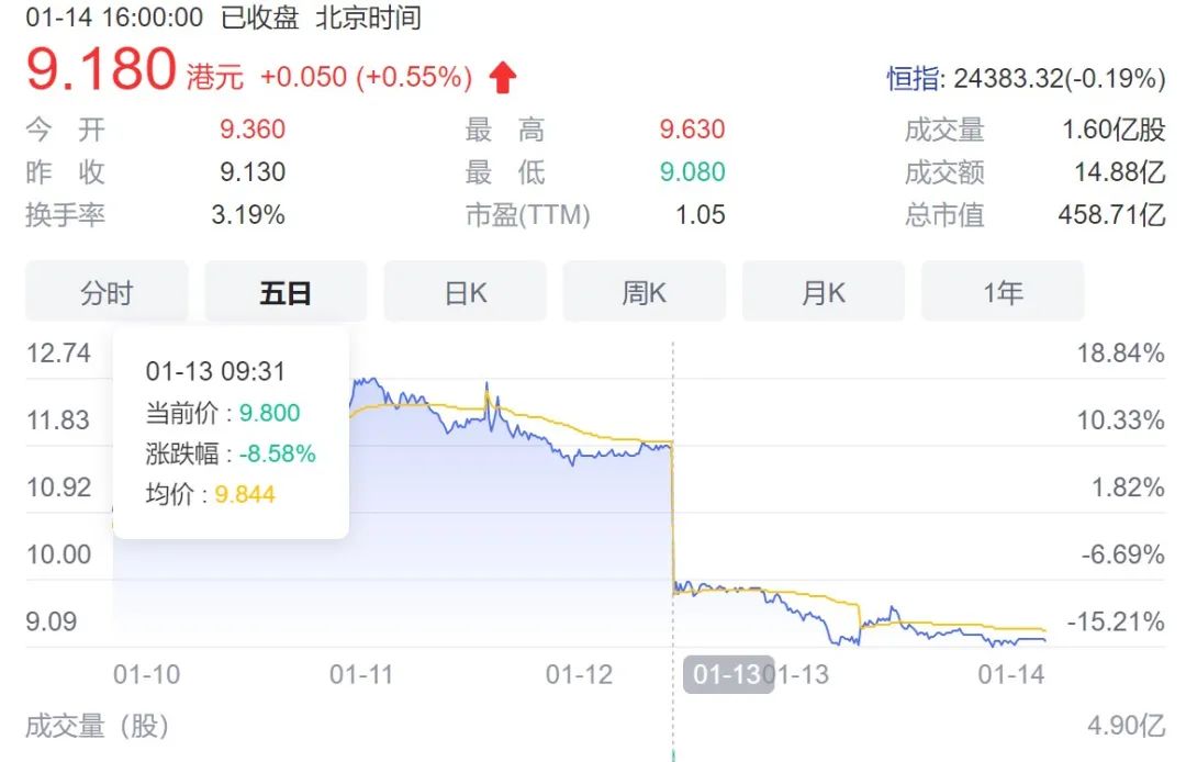 或許是受此消息影響,融創(chuàng)中國的港股股價(jià)于1月13日當(dāng)天急劇下跌,14日稍有回升但依然在相對低位。