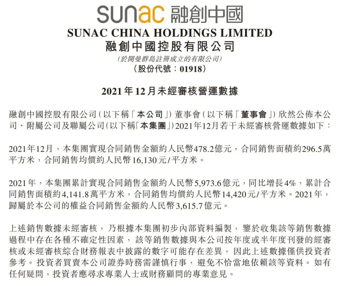 接著2021年底,據(jù)新京報(bào)消息,融創(chuàng)中國出售上海虹橋商務(wù)區(qū)寫字樓、杭州核心地段酒店及寫字樓等三個(gè)項(xiàng)目,預(yù)計(jì)交易總價(jià)約26.8億元。