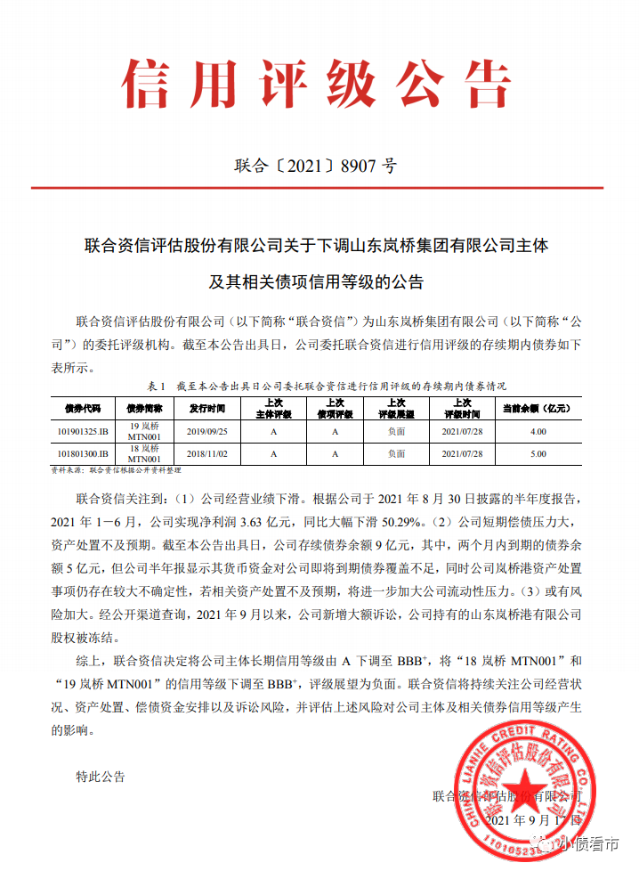 9月17日,聯(lián)合資信公告稱(chēng),決定將山東嵐橋集團(tuán)有限公司(以下簡(jiǎn)稱(chēng)“嵐橋集團(tuán)”)主體和“18嵐橋MTN001”、“19嵐橋MTN001”信用等級(jí)由A下調(diào)至BBB+,評(píng)級(jí)展望為負(fù)面。