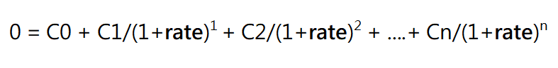 如何反推呢,所用的方法是將每筆現金流量以利率rate折現,然后令所有現金流量的凈現值(NPV)等于零。若C0、C1、C2、C3...Cn分別代表為期初到n期的現金流量,正值代表現金流入,負值代表現金流出。