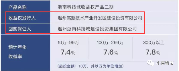 據(jù)悉,該收益權(quán)產(chǎn)品回購(gòu)保證人為溫州浙南科技城建設(shè)投資集團(tuán)有限公司(以下簡(jiǎn)稱“浙南科技城建投集團(tuán)”),產(chǎn)品期限為兩年,資金用途為浙南科技城八大重點(diǎn)項(xiàng)目建設(shè),認(rèn)購(gòu)起點(diǎn)金額為10萬元。