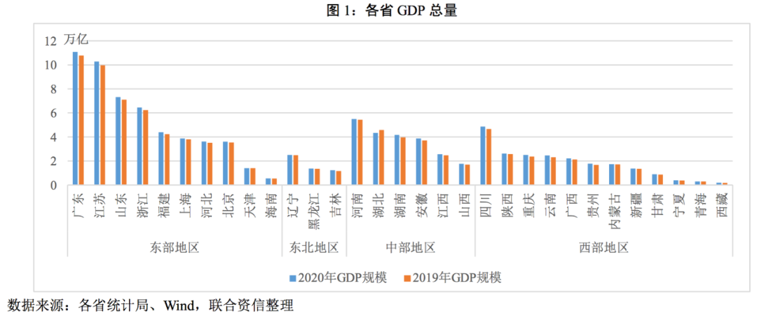 ?GDP總量在經(jīng)濟(jì)相對發(fā)達(dá)地區(qū)和欠發(fā)達(dá)地區(qū)的分化較為明顯,東部地區(qū)繼續(xù)維持領(lǐng)跑態(tài)勢;2020年,除湖北以外,其余30個省份GDP增速全部轉(zhuǎn)正,中西部地區(qū)增速分化更為明顯,東北地區(qū)經(jīng)濟(jì)恢復(fù)相對較慢,東部地區(qū)則相對較為均衡。