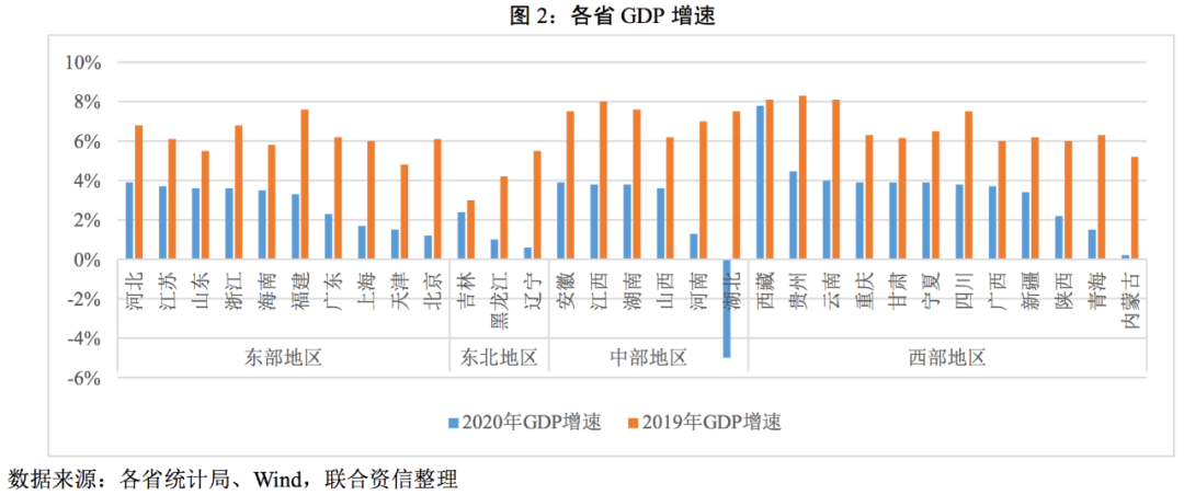 從GDP增速看,2020年除湖北以外,其余省份增速全部為正,其中西藏以7.80%的增速領(lǐng)跑全國,主要是其受疫情沖擊較小;貴州以4.46%的增速連續(xù)第四年位列第二。整體看,有20個省份的GDP增速超過全國。分區(qū)域看,東部地區(qū)增速相對較為平穩(wěn),中部和西部地區(qū)GDP增速分化更為明顯,東北地區(qū)經(jīng)濟(jì)增速相對較低。