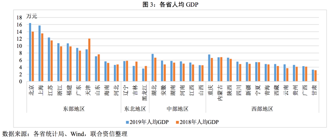 2020年各省份GDP規(guī)模變動不大,且人口流動短期內(nèi)并不會有趨勢性的變化,因此我們采用2019年的人均GDP進(jìn)行觀察。從2019年人均GDP規(guī)模看,東部地區(qū)領(lǐng)跑全國,除了東部地區(qū)以外,其他地區(qū)沒有明顯分化。大部分省份人均GDP隨著經(jīng)濟(jì)規(guī)模的擴(kuò)大而進(jìn)一步提升,值得注意的是東三省以及天津、山東,2019年人均GDP較2018年反而下降,尤其是天津下降顯著,主要是因為天津及東三省的產(chǎn)業(yè)結(jié)構(gòu)均以石油化工、鋼鐵等傳統(tǒng)工業(yè)為主,而近些年隨著我國經(jīng)濟(jì)的轉(zhuǎn)型,傳統(tǒng)經(jīng)濟(jì)增長動力放緩,造成經(jīng)濟(jì)增長放緩、人均GDP下降。