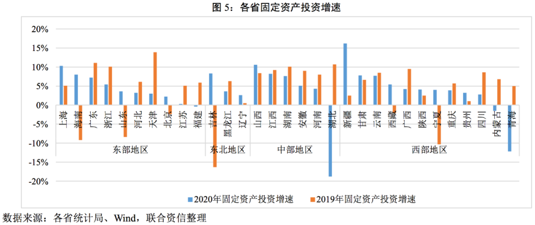 2020年各省份的固定投資增速較2019年有較大的變化,其中有13個省份固定資產(chǎn)投資增速超過2019年,18個省份不及2019年。除福建、內(nèi)蒙古、青海以及湖北以外,其余27個省份固定資產(chǎn)投資增速均實現(xiàn)正增長。中部地區(qū)固定資產(chǎn)投資增速整體相對較高,除湖北以外均超過4%(全國固定資產(chǎn)投資增速為2.90%);西部地區(qū)分化較為明顯。