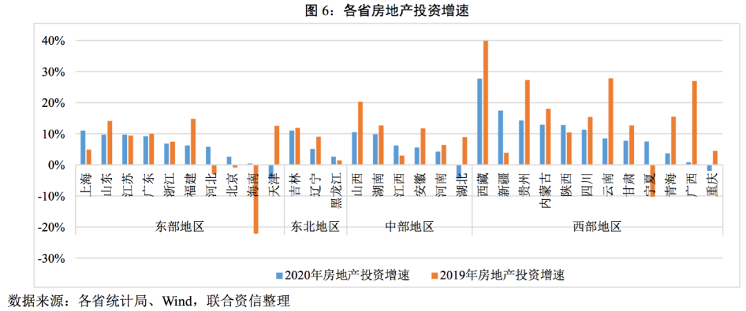 房地產(chǎn)投資方面,2020年31個省份中除重慶、天津以及湖北以外,其余28個省份房地產(chǎn)投資均為正增長;有15個省份房地產(chǎn)增速高于全國增速(7%),且有9個省份的增速已經(jīng)超過2019年同期水平。分區(qū)域看,西部地區(qū)房地產(chǎn)投資增速整體高于其他省份。進(jìn)一步比較固定資產(chǎn)投資增速與房地產(chǎn)投資增速發(fā)現(xiàn),僅江西、黑龍江、廣西、海南、重慶以及天津的固定投資增速大于房地產(chǎn)投資增速,大部分省份的固定投資增速依賴于房地產(chǎn)投資支撐,與全國投資結(jié)構(gòu)相同。
