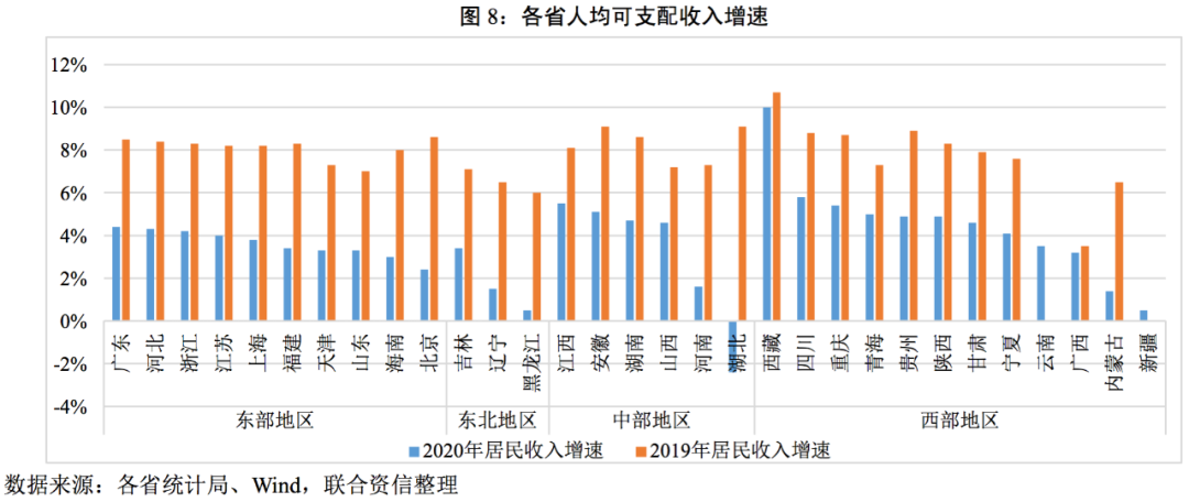 從2021年居民可支配收入增速看,除湖北以外,其余30個省份居民可支配收入增速全部實現(xiàn)正增長,且全部低于2019年水平。除了云南、山東、廣西、海南、新疆以及黑龍江以外的25個省份居民收入增速超過該省GDP增速,其中西藏延續(xù)2015年以來的領(lǐng)跑全國的趨勢,主要是由于西藏的中央轉(zhuǎn)移支付力度較大,受疫情影響較小。分區(qū)域看,西部地區(qū)居民收入增速分化最為明顯,中部地區(qū)次之,且中部和西部地區(qū)居民收入增速整體高于東部和東北地區(qū),居民人均可支配收入增速前十均為中部和西部省份,或與其基數(shù)較低相關(guān)。整體看消費增速恢復(fù)最快的省份的居民可支配收入增速排名也較為靠前,比如江西、安徽、貴州等省份,但部分省份的消費增速排名與可支配收入增速排名并不完全一致,主要是因為旅游、網(wǎng)購等跨省消費的存在。