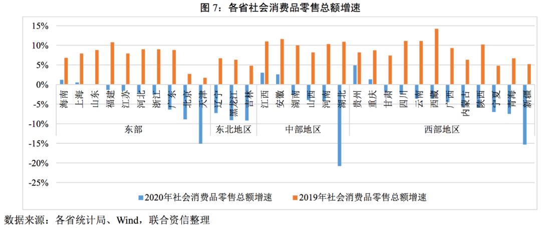 2020年全國31個省份中僅6個省份實現(xiàn)正增長,且全部尚未恢復(fù)至2019年的消費水平。貴州、江西、安徽等省份消費增速延續(xù)了2015年以來的名列前茅,其GDP增速表現(xiàn)也較為優(yōu)異,主要是其近幾年發(fā)展的優(yōu)勢新興產(chǎn)業(yè)發(fā)展較快,如貴州的電子元件、江西的半導(dǎo)體以及安徽的芯片、半導(dǎo)體以及人工智能等,帶動了經(jīng)濟(jì)的發(fā)展從而促進(jìn)居民的消費能力提升。分區(qū)域看,東部、中部以及西部地區(qū)消費增速分化明顯,而東北地區(qū)消費增速排名整體較為靠后。