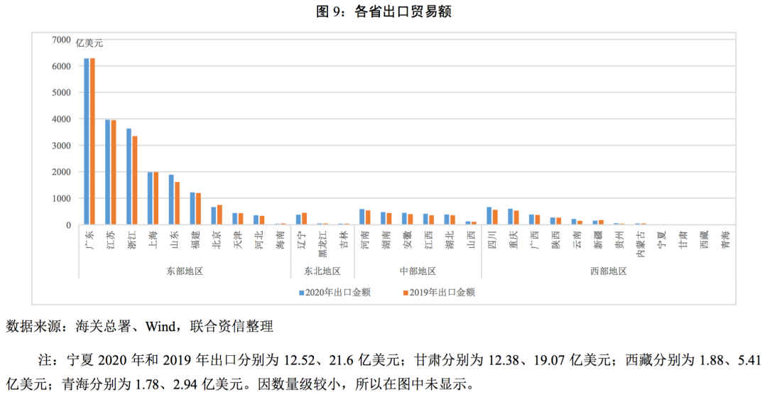 外貿(mào)方面,區(qū)域出口集中度較高。2020年,東部地區(qū)沿海城市廣東、江蘇、浙江、上海、山東以及福建出口貿(mào)易額(按美元計價)占全部出口貿(mào)易額的73.24%,上述六省出口額較2019年增長3.17%(全國增長3.60%);而全年出口額不足百億的省份全部集中在西部和東北地區(qū)。與2019年相比,有12個省份出口金額出現(xiàn)下降,19個省份出口金額上升。分區(qū)域看,2020年東部、西部、中部以及東北地區(qū)出口占我國總出口比重分別為79.11%、9.53%、9.52%和1.84%,與2019年相比,中部、東部和東北地區(qū)出口比重均有下降,其中中部地區(qū)出口比重下降5.33個百分點,下降較為明顯,西部地區(qū)出口比重略有上升。在我國的出口中,出口額較大的產(chǎn)品有機(jī)電設(shè)備、紡織品、家具玩具和車輛及零部件等,與上述東部沿海六省的產(chǎn)業(yè)結(jié)構(gòu)相對應(yīng),同時沿海的地理位置也為其出口提供了很大便利。
