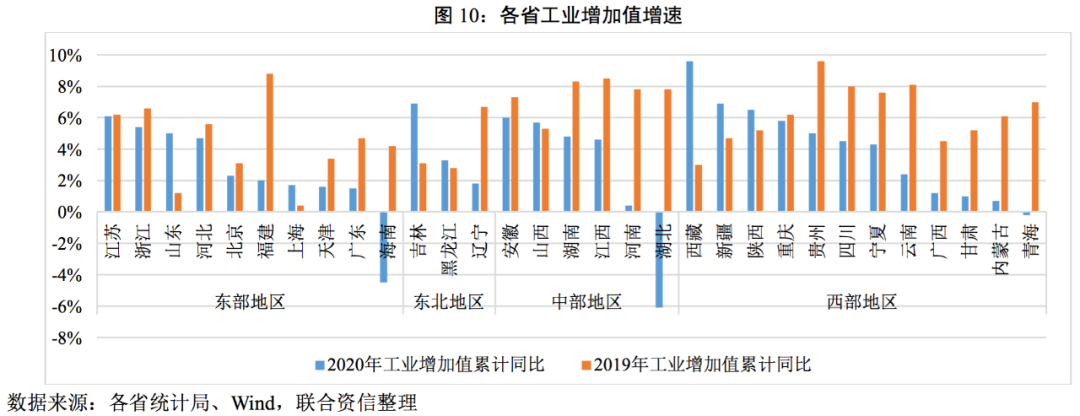 ?工業(yè)生產(chǎn)方面,僅青海、海南以及湖北三個省份的工業(yè)增加值增速尚未轉(zhuǎn)正;東部地區(qū)工業(yè)企業(yè)利潤遙遙領(lǐng)先,中部和西部地區(qū)次之,東北地區(qū)明顯落后;區(qū)域內(nèi)分化程度進(jìn)一步加劇。
