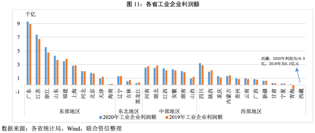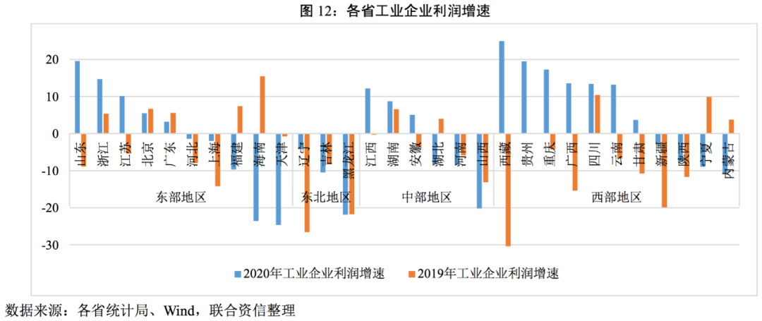 從企業(yè)利潤增速看,2020年工業(yè)利潤增速最大值與最小值差距為44.30%(2019年為42.1%),地區(qū)間的差異較2019年進(jìn)一步加大。有15個省份工業(yè)企業(yè)利潤為負(fù)增長,較2019年減少3個省份;17個省份工業(yè)企業(yè)利潤增速超過2019年。分區(qū)域看,東部、西部和中部地區(qū)各省份分化均較為明顯,且有進(jìn)一步加劇的趨勢,東北地區(qū)三省全部負(fù)增長,主要是因為2020年國際大宗商品價格不景氣在一定程度上壓縮黑色金屬以及石油開采及加工行業(yè)的利潤。