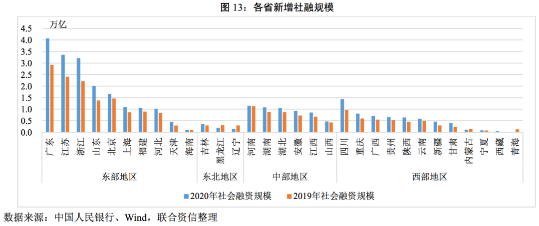 區(qū)域間的流動性分化明顯,GDP規(guī)模較大的省份獲得了更多的流動性支持。2020年,東部地區(qū)廣東、江蘇、浙江以及山東僅四個省份新增社融規(guī)模占全國新增社融的41.93%,東北地區(qū)新增社融規(guī)模比重只占全國新增社融的2.25%,地區(qū)間差異很大。整體看,2020年僅黑龍江、遼寧、內(nèi)蒙古以及青海的新增社融低于2019年水平,在全國新增社融大幅增長的背景下,上述四個省份的新增社融規(guī)模反而較2019年下降,進(jìn)一步反映了資金的“擇優(yōu)”選擇性。從社融結(jié)構(gòu)看,各區(qū)域分化程度也較為明顯,東部地區(qū)對貸款的依賴度相較其他地區(qū)較低,直接融資比重較高;經(jīng)濟(jì)規(guī)模較小的省份,如青海、東三省,政府債券融資占比較高。