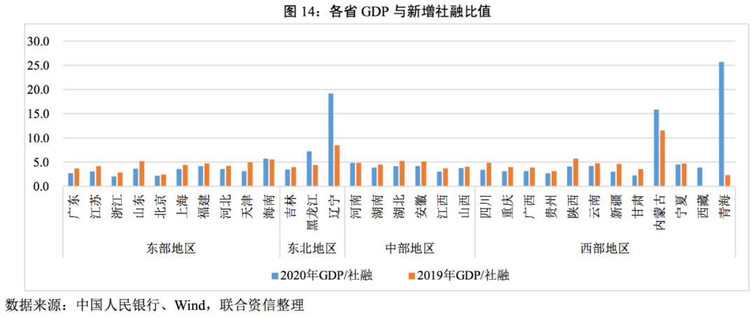 GDP與新增社融的比值可以衡量各省份的資本使用效率。從各省的數(shù)據(jù)看,大部分省份的資金并未有效拉動GDP的增長,如廣東、江蘇、浙江、山東等融資大省,資金使用效率較低,且與2019年相比進(jìn)一步降低,與之相反的是,遼寧、內(nèi)蒙古、青海等經(jīng)濟(jì)規(guī)模較小的省份,資金使用效率較高,主要是由于這些地區(qū)的政府債券融資比重較大且經(jīng)濟(jì)規(guī)模較小,因此對經(jīng)濟(jì)的拉動效應(yīng)較為明顯。