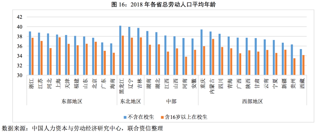 從勞動力人口來說,報告測算的數(shù)據(jù)顯示,1985-2018年間,全國勞動力人口(包括學(xué)生)的平均年齡從32.2歲上升到了38.4歲。平均年齡最高的前五個省份是黑龍江、遼寧、吉林、重慶、湖南;平均年齡最低的五個省份是廣東、新疆、海南、貴州、西藏。勞動人口的年齡分布基本與人口流動相一致,北京、上海等老齡化已逐步抬頭的較發(fā)達(dá)城市,得益于勞動力涌入而在該指標(biāo)中排名中等;東北三省多年以來的人口流出使得該地區(qū)的勞動人口平均年齡顯著高于其他地區(qū)。
