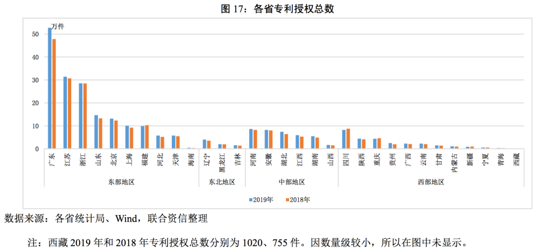 各省的科技水平也有較大差異。以專利授權(quán)數(shù)量作為各省科技水平的衡量,廣東、江蘇以及浙江具有明顯的優(yōu)勢,整體來看,擁有專利數(shù)量在10萬件以上的省份共有6個,且均集中在東部地區(qū)。整體看,專利授權(quán)數(shù)量與各省的經(jīng)濟(jì)實力呈正相關(guān)的關(guān)系,經(jīng)濟(jì)規(guī)模較大的省份擁有更多的專利數(shù)量。
