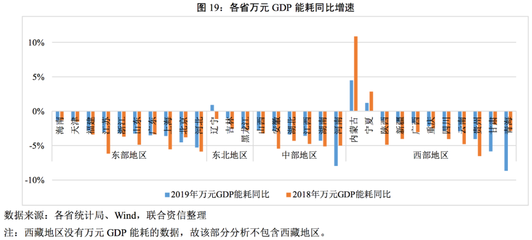 分區(qū)域看,2019年大部分省份的GDP能耗同比均有所下降,而內(nèi)蒙古和寧夏連續(xù)兩年均為正增長,且內(nèi)蒙古的增速高達(dá)4.49%,遼寧則由2018年的能耗下降轉(zhuǎn)為2019年的增長。習(xí)近平總書記在十九屆五中全會、中央經(jīng)濟(jì)工作會議、中央全面深化改革委員會會議等重要會議多次強(qiáng)調(diào)了抓緊制定碳排放達(dá)峰與碳中和行動方案,2020年《政府工作報告》規(guī)劃了“十四五”期間我國的能源消耗和碳排放工作。上述政策將會對以鋼鐵和石油化工等傳統(tǒng)工業(yè)為主的省份,如東三省、河北以及天津等,帶來較大的產(chǎn)業(yè)轉(zhuǎn)型壓力,同時對經(jīng)濟(jì)增長帶來一定的壓力。