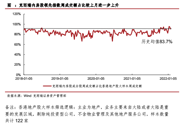 1月克而瑞內(nèi)房股領(lǐng)先指數(shù)成交額占香港地產(chǎn)股大樣本的成交額比值總體較上月進(jìn)一步上升,走勢向下。1月該指數(shù)成交額占比周均值92.5%,高于歷史均值83.7%,高于上月周均值87.4%,于月末同樣出現(xiàn)占比明顯下降的情況,使總體走勢向下。