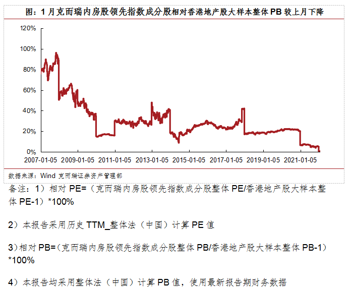 1月克而瑞領(lǐng)先股指上升6.9%,估值維持低位,成分股表現(xiàn)較好。