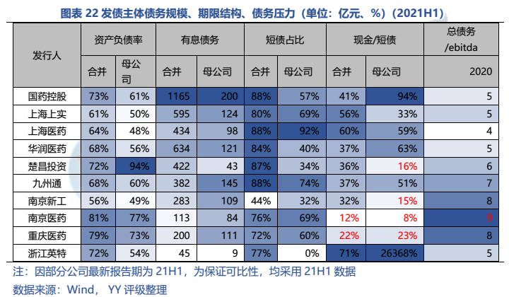 4)南京醫(yī)藥、南京新工本部、楚昌投資本部有一定短債壓力,現(xiàn)金/短債在25%以下;長(zhǎng)期償債能力上,九州通、南京醫(yī)藥、南京新工和浙江英特較弱,總債務(wù)/ebitda在9倍以上。