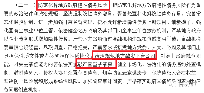 首先需要說明的是,《意見》中關(guān)于地方政府融資平臺(tái)的意見,是在“防范化解地方政府隱性債務(wù)風(fēng)險(xiǎn)”項(xiàng)下的,重點(diǎn)關(guān)注的是隱性債務(wù)。