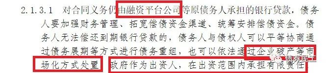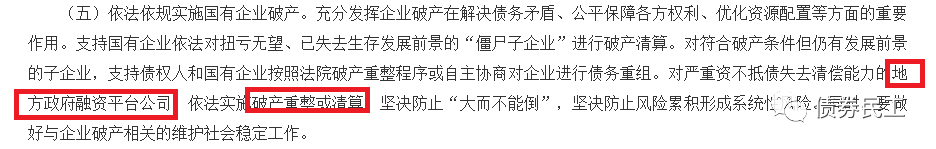 (2)對于企業(yè)債券的償債責(zé)任履行,鼓勵(lì)債務(wù)人(融資平臺(tái)公司)按照企業(yè)債券類債務(wù)有關(guān)管理政策進(jìn)行債務(wù)重組或者通過企業(yè)破產(chǎn)等市場化方式處置。這里的企業(yè)債券概念應(yīng)該是廣義上的信用債券概念,也是通過債務(wù)重組和破產(chǎn)方式進(jìn)行化解債務(wù)問題。