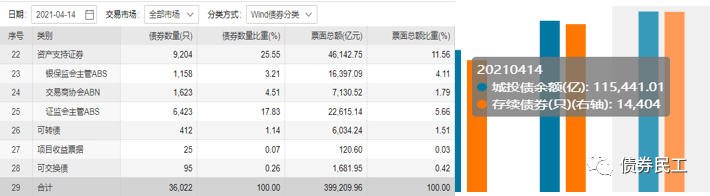 從概念上來講,地方政府融資平臺(tái)和城投公司基本上市可以劃等號(hào)的。城投債已經(jīng)是信用債券非常重要的一個(gè)組成部分。根據(jù)wind資訊的信用債研究和城投債研究統(tǒng)計(jì)數(shù)據(jù),截至2021年4月14日,信用債券存量金額為399,209.96億元,存續(xù)只數(shù)為36,022只;城投債存量金額為115,441.01億元,占信用債券的比例為28.92%,存續(xù)債數(shù)為14,404只,占信用債券的比例為39.99%。
