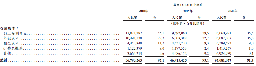 其營業(yè)成本從大到小依次是員工福利開支、外包成本、租金成本、折舊及攤銷和其他,僅前兩項就占到了整體成本的七成。營業(yè)成本占總收入的比重高達91%至97%,毛利空間在2020年最高時也只達到8.58%。