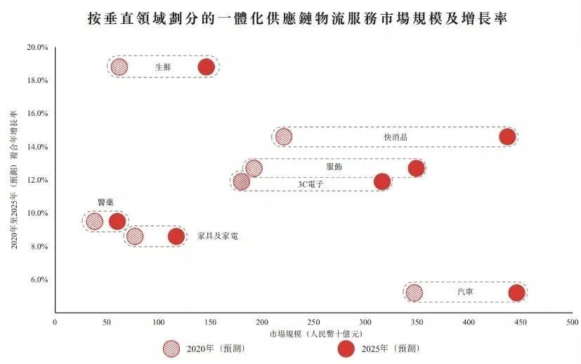 從增長率來看,2020年至2025年,生鮮、快消品及服飾的一體化供應(yīng)鏈物流支出增長率領(lǐng)先,分別為18.8%、14.6%及12.7%。當(dāng)然,其他領(lǐng)域需求總量也不低,到2025年,汽車行業(yè)、3C電子、家具及家電行業(yè)、醫(yī)藥行業(yè)對一體化供應(yīng)鏈物流服務(wù)的需求,將分別增至4460億元、3160億元、1170億元和600億元。