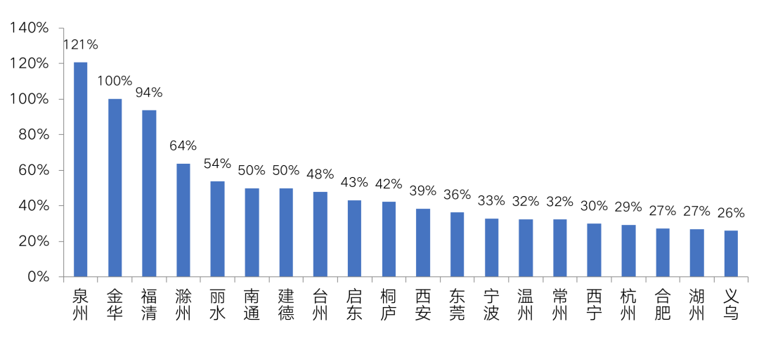 除長三角城市以外,泉州、東莞以及未在重點城市之列的西安和西寧兩個二線城市市場熱度也保持高位。其中溢價率最高的城市是泉州,高達121%。