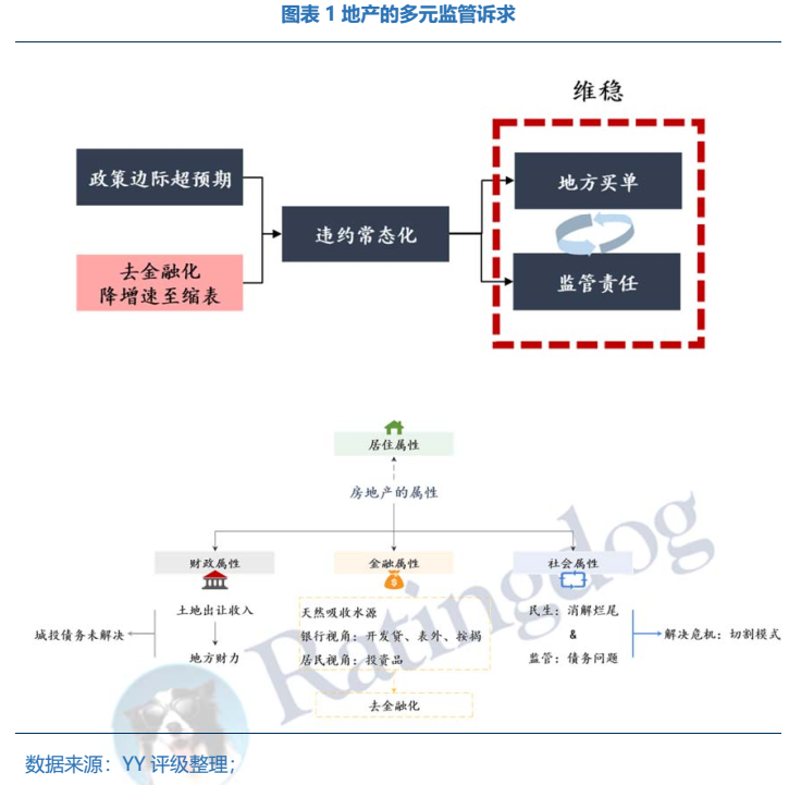在21年圣誕節(jié)前夕的地產(chǎn)黑夜與黎明路演中我們?cè)f道,這一輪大周期的中樞為政策的去金融化,其造成的成本外溢和市場(chǎng)頻繁違約將促使監(jiān)管機(jī)構(gòu)間的執(zhí)行與糾偏,從而使得市場(chǎng)面臨持續(xù)性的短中期波動(dòng)。而如何看待機(jī)構(gòu)間的立場(chǎng)與政策解讀成為也將成為后續(xù)解讀短期擾動(dòng)因素的主要工具。