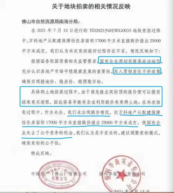 被端上這次土拍盛宴的一宗地,光入場保證金就得8.4億,地塊起拍價達(dá)42億,上限價是50.9億。狗蛋說,如果搶這樣一塊地所付出的價格去“戰(zhàn)拓”寶能汽車,都可以讓對方硬氣很久了。因?yàn)樽诘貙儆趶V佛交界的三山新城,10米之外就是廣州,優(yōu)越的地理?xiàng)l件吸引了8家房企帶重金前來。拿地隊(duì)伍里,有一半是中海、保利、招商蛇口、華潤這樣的央企,還有萬科,多半是不差錢的主。在地塊開拍之前的報(bào)名階段,各家房企的投拓人員把建筑學(xué)、經(jīng)濟(jì)學(xué)、心理學(xué)都應(yīng)用到了拿地方案里。這次競拍有一個規(guī)則:地價觸頂后,哪一家先報(bào)出25000㎡配建的即為競得人。8個男孩一同去提親,女孩的父親說聘禮底價是10萬,封頂價是20萬,誰給20萬同時又愿意幫我家蓋5層房子的,可以直接叫我爸。在進(jìn)行一次次模擬博弈之后,男孩們上場了。沒想到,大家你一層我半層,剛剛喊到幫忙配建兩層半小樓的時候,其中一個男孩直接“叫爸”,表示5層我要了。 萬科從配建保障性住房面積17000㎡,一口氣跳價報(bào)出25000㎡,宣布競拍結(jié)束。別人才開始預(yù)熱,刀槍棍棒琴棋書畫還沒比拼完呢,好家伙,萬科自己先沖出去入洞房了。最終,萬科以總價50.2億元+配建2.5萬平方米的“雙封頂”拿下地塊,樓面價2.3萬每平,躋身佛山單價地王之一。大概是覺得萬科太不講武德了,事后,中海和保利越想越氣,7月14日,他們聯(lián)合起來,給佛山市自然資源局南海分局寫了一份信,反映這樣的報(bào)價過程存在不妥。大概意思是說,作為國有企業(yè)應(yīng)該提高政治站位,要有“房住不炒”的覺悟,俺們保利和中海都是央企,在競拍過程中還是挺隱忍的,沒有跳價。但老萬他不行啊,一個跳價把游戲玩死了,一點(diǎn)都不和諧,也讓大家失去了公平競爭的機(jī)會。中保組合建議,應(yīng)該“調(diào)整競標(biāo)模式,確保競標(biāo)的公平性”。這下,大家反而覺得是中保不講武德了。狗蛋說:老萬是在規(guī)則內(nèi)憑本事拿的地呀。大家和狗蛋一樣,都誤讀了“中保”的良苦用心。看著是杠萬科,其實(shí),他們是想讓岳父們改改提親的流程。不過,他們的訴求沒得到支持,佛山市自然資源局南海分局相關(guān)負(fù)責(zé)人回應(yīng)媒體稱:交易規(guī)則是公開透明的,中海、保利的訴求不合理,我們不予支持。萬科拿地后,該地塊周邊的保利華僑城云禧提價10%。這場風(fēng)波里的三個主角,都是佛山地產(chǎn)圈的老手,佛山樓面價top10里頭,他們?nèi)夷玫牡卣家话搿=衲晟习肽辏鹕脚某龅牡貕K中,總價TOP10榜單上,保利占3席,中海占2席,萬科占1席。放在全國,這三家也是當(dāng)仁不讓的“大腿”,在上半年拿地金額排行榜上,萬科和保利分列一二,中海也占據(jù)前十位置。這兩天,大家都在調(diào)侃卷煙廠超級“卷”,連流水線上的操作工都用到了武大碩士、人大學(xué)子。地產(chǎn)行業(yè)的卷,很多人實(shí)實(shí)在在感受到了,像狗蛋鄰居大娘就有體會,她兒子在深圳干中介,這幾天準(zhǔn)備收攤了,大娘說,現(xiàn)在的房地產(chǎn)不好干啊。“三條紅線”“供地兩集中”“二手房限貸”各種政策層出不窮,地產(chǎn)行業(yè)現(xiàn)在比包菜還卷。以前大魚吃小魚,快魚吃慢魚。今年3月的萬科業(yè)績發(fā)布上,有投資者問在當(dāng)下的行業(yè)環(huán)境中,萬科未來的機(jī)會在哪里?郁亮回答:機(jī)會不再是唾手可得,得掙“慢錢、長錢和老實(shí)錢”。大家也別怪老萬,如果當(dāng)初姚振華拿下萬科,老萬現(xiàn)在肯定沒錢買買買。