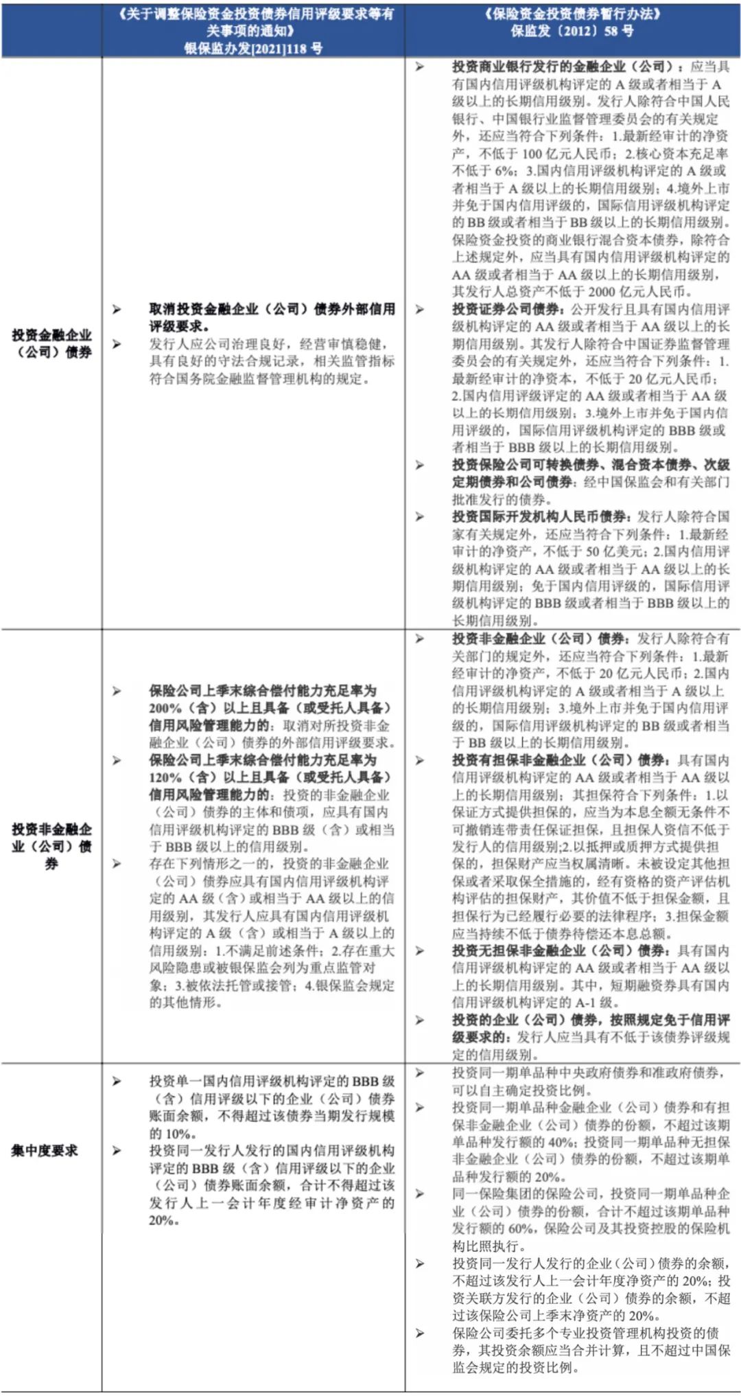 與《辦法》相比,《通知》主要有以下改變:在金融企業(yè)債券方面,取消投資金融債券外部信用評(píng)級(jí)要求;在非金融企業(yè)債券方面,放松了投資非金融企業(yè)債券外部信用評(píng)級(jí)的要求,根據(jù)償付能力充足率指標(biāo)對(duì)不同保險(xiǎn)公司投資范圍進(jìn)行區(qū)別劃分,同時(shí)明確了外部級(jí)別在BBB級(jí)(含)以下的企業(yè)(公司)債券投資集中度要求。從以上不同我們可以看出,在把控風(fēng)險(xiǎn)的前提下,《通知》著力于放松對(duì)保險(xiǎn)資金具體投向的限制,擴(kuò)大保險(xiǎn)資金可投資范圍,鼓勵(lì)保險(xiǎn)公司加強(qiáng)自身風(fēng)險(xiǎn)控制和內(nèi)評(píng)體系,減少對(duì)外部信用評(píng)級(jí)的依賴,充分發(fā)揮保險(xiǎn)資金的作用。