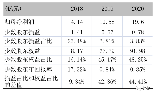 少數(shù)股東權(quán)益占比,過往三年逐年攀升,但相應(yīng)少數(shù)股東的損益沒有同比增長。與此同時,少數(shù)股東權(quán)益占比與損益占比的差值逐漸擴(kuò)大,且少數(shù)股東年回報率下降明顯。
