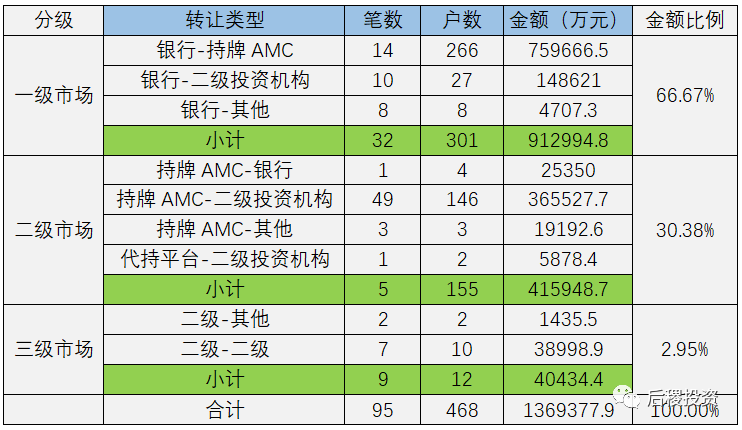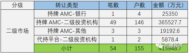 根據(jù)已有數(shù)據(jù)顯示,二級(jí)市場總成交155戶,總成交金額41億余元。成交規(guī)模最大的是持牌AMC-二級(jí)投資機(jī)構(gòu),成交金額在二級(jí)市場中占89%。