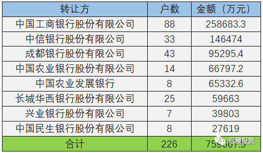 從上圖來看,工商銀行排名第一,全年出讓金額近26億元,占比34%;中信銀行與成都銀行排名二三,其余五家銀行出讓金額相差不大。