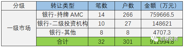 根據(jù)已有數(shù)據(jù)顯示,一級(jí)市場總成交301戶,總成交金額91億余元,成交規(guī)模最大的為銀行-持牌AMC,成交金額占比在一級(jí)市場中占83.2%,在全年總成交額中占55.5%。