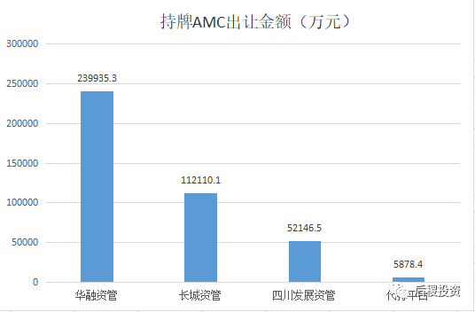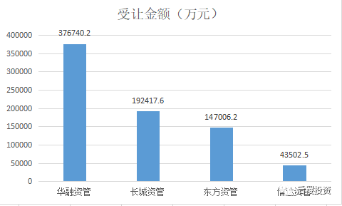 從上圖看,華融資管受讓37.67億元,受讓規(guī)模行業(yè)第一,長城資管與東方資管受讓金額差距不大,位列二、三名,信達(dá)資管受讓金額最少位列第四。