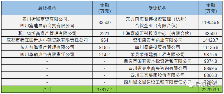 對(duì)比上圖數(shù)據(jù),華融資管與長城資管均是受讓金額大于出讓金額;未查詢到東方資管、信達(dá)資管出讓記錄,未查詢到四川發(fā)展資管與代持平臺(tái)受讓記錄。